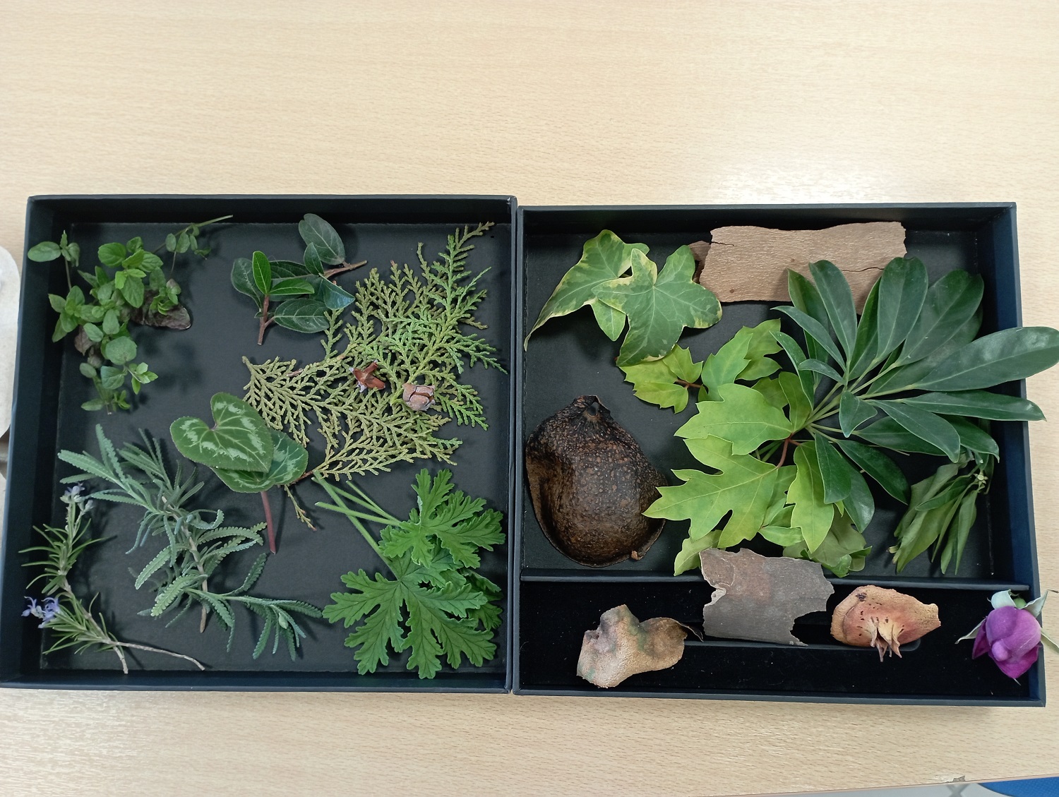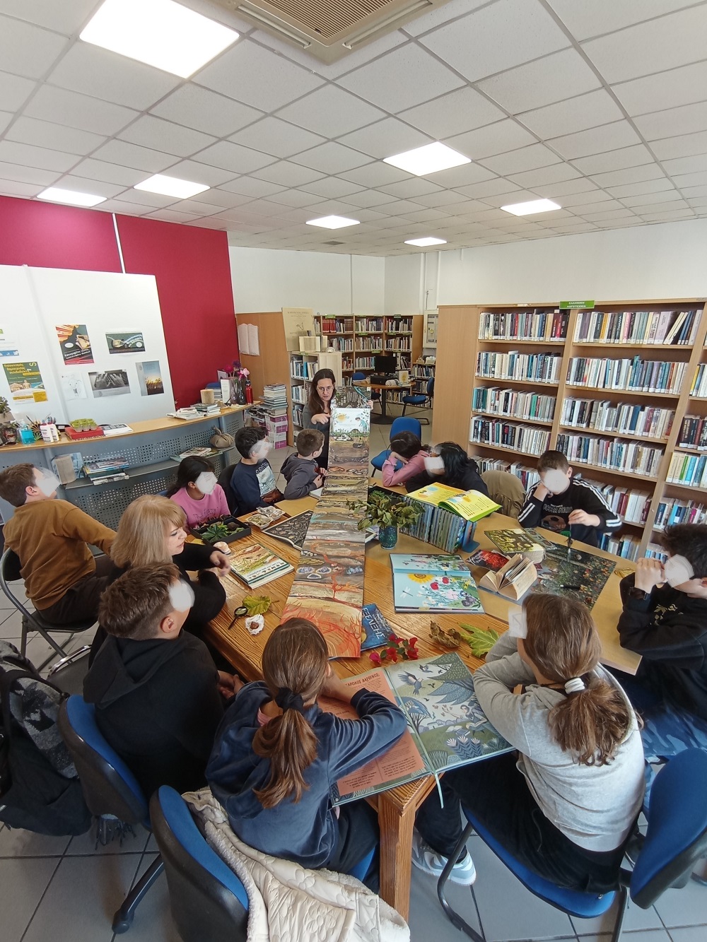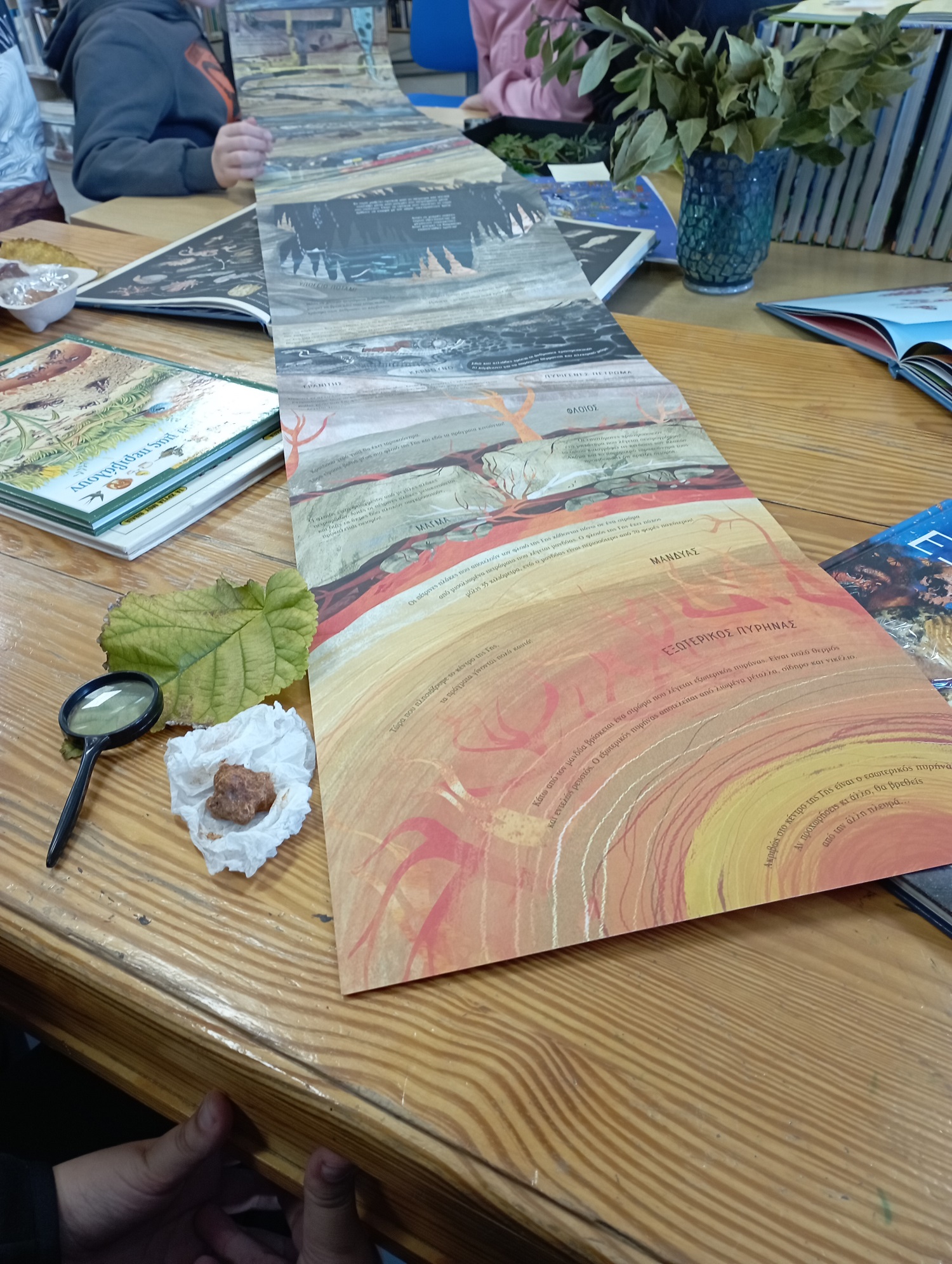 Από τα φύλλα μουριάς που συνέλεξαν από τα δέντρα της Πλατείας, βρέθηκαν στη συλλογή αρωματικών φυτών και σπόρων που βρήκαν στην Βιβλιοθήκη. Ταξίδεψαν στα στρώματα της Γης από την επιφάνεια μέχρι το μάγμα, σε ένα υπέροχο αναδιπλωμένο βιβλίο, ενώ φυτολόγια και περίτεχνα βιβλία για τη φύση βρέθηκαν στα χέρια τους όπου συνέλεξαν εικόνες και πληροφορίες.